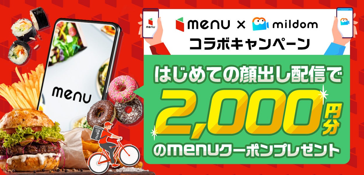 ライブ配信サービス「Mildom(ミルダム)」を運営する株式会社DouYu Japan(ドウユウジャパン)は、フードデリバリー&テイクアウトアプリ 「menu(メニュー)」とコラボレーションし、2022年2月24日(木)より「menu」で使えるクーポン2,000円分をプレゼントする『menu x Mildomコラボキャンペーン』を開催いたします。